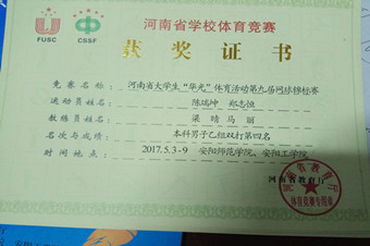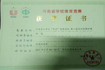 5月20日至28日,我校派出的羽毛球代表队在华北水利水电大学举办的河南省大学生“华光”体育活动第七届羽毛球锦标赛中经管ng娱乐 柯苇同学取得“优秀运动员”称号,王洪海老师获得“优秀教练员”称号。