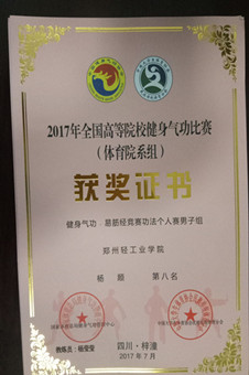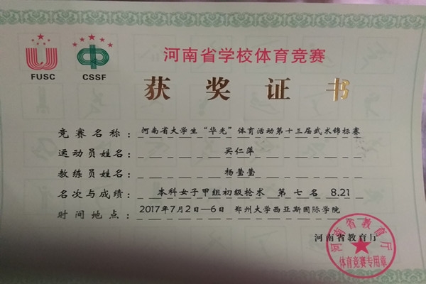 7月2日至6日,我校武术代表队参加了在郑州大学西亚斯国际ng娱乐 举办的河南省大学生“华光”体育活动第十三届届武术锦标赛,我校买仁萍同学获得本科女子甲组初级枪术第7名,赵智超获得“优秀运动员”称号,杨莹莹老师获得“优秀教练员”称号。