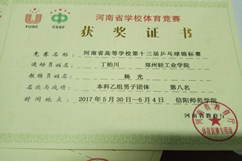 5月30日至6月4日,我校乒乓球代表队参加了在信阳师范ng娱乐 举办的河南省高等学校第十三届乒乓球锦标赛,ng28娱乐官网 社会体育指导与管理专业丁柏川、朱潇骁、熊紫荆同学取得本科乙组男子团体第8名,杨光老师获得“优秀教练员”称号。