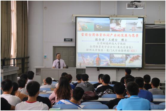 9月26日上午,受ng28娱乐官网 邀请,台湾著名体育学者、高雄树德科技大学运动管理系专任教授王建台博士前来郑州轻工业ng娱乐 ,以“当前台湾体育休闲产业的发展与愿景”为题,在教三楼200为我校师生作了一场精彩生动的专题讲座。