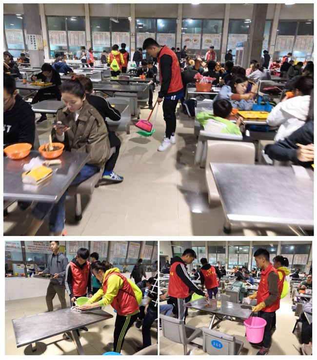 下午六点半,正值同学们晚饭期间,为让大家有更好的就餐环境,志愿服务队的同学们分工明确积极主动找活干,帮助食堂的工作人员收拾餐具以及餐桌上的垃圾、擦桌子、打扫地面等等,在将近一个小时的时间里,不仅对食堂运作有了了解,同学们也深刻体会到了食堂工作人员的艰辛。活动现场,志愿者们还号召同学们一起积极文明就餐,给大家共同营造一个好的就餐环境。