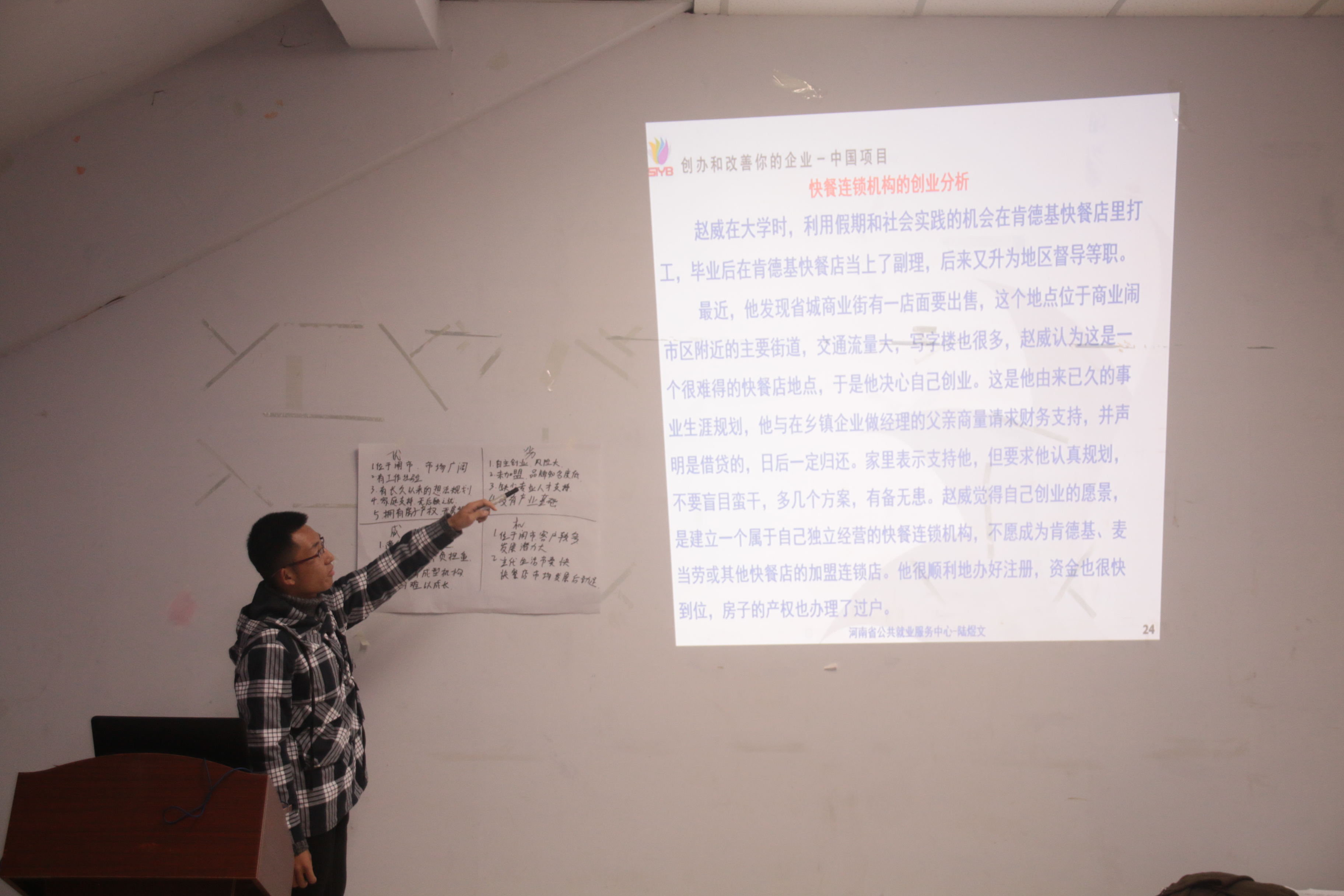 培训中,讲师向同学们介绍了GYB培训内容以及掌握GYB重要性,针对如何提高同学们的创新创业热情,同学们积极讨论并踊跃发言。在培训中,培训讲师从一个创业想法的产生与形成、如何实践创业和如何规避创业风险等方面重点讲解了大学生产生创业想法,进行创业实践的理论知识和方式方法,并通过与同学们之间的互动以及同学与同学之间的互动,使同学们掌握了GYB的重要知识。培训的最后,同学们畅所欲言,就创新创业过程中的困难、困惑咨询了讲师,讲师和同学们一起交流了意见和建议。