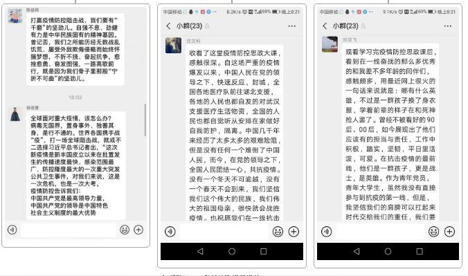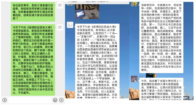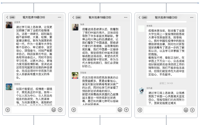 此次思政课上,清华大学艾四林、中国人民大学秦宣、北京师范大学王炳林、中央财经大学冯秀军四位教授结合抗疫实践,紧密围绕思政课教学内容,从实践、理论、历史以及时代大学生的责任与担当几个维度,解读了以习近平同志为核心的党中央关于疫情防控的决策部署 ,分析了在抗疫中彰显的中国共产党领导和中国特色社会主义制度的显著优势,讲述了防控战疫一线的感人故事。直播结束后,各班级辅导员带领同学们通过线上主题班会、线上团日活动等形式,围绕思政课内容展开了热烈的讨论,并发表了自己的感悟。