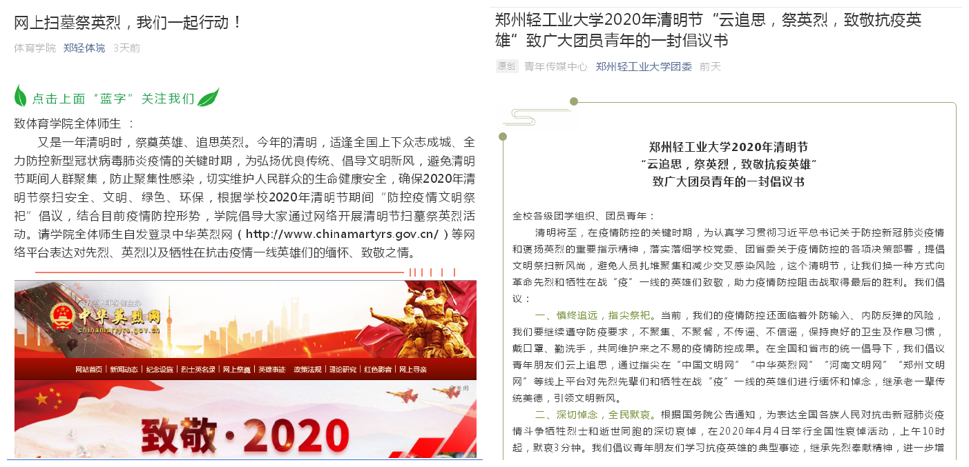 活动开始前,ng28娱乐官网 向师生发出了《网上扫墓祭英烈,我们一起行动!》的倡议书,并向广大团员青年发出了《“云追思,祭英烈,致敬抗疫英雄”致广大团员青年的一封倡议书》,倡导广大师生通过网上祭奠的方式进行清明祭扫。活动中,师生们登录“中国文明网”、“中华英烈网”、“河南文明网”、“郑州文明网”等网络平台,为英烈献花,进入陵园为烈士扫墓,了解烈士们为祖国为人民抛头颅、洒热血,不惜牺牲自己生命的感人事迹,向为国家富强而英勇献身的民族英烈和牺牲在战“疫”一线的英雄们致敬,表达追思缅怀之情。活动后,师生通过微信和QQ等平台发表追思感想,表达了自己对革命先烈的敬意,对在抗击新冠肺炎疫情中牺牲烈士和逝世同胞表达深切哀悼。