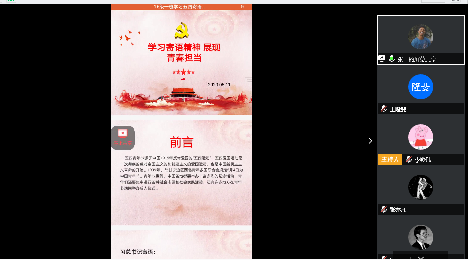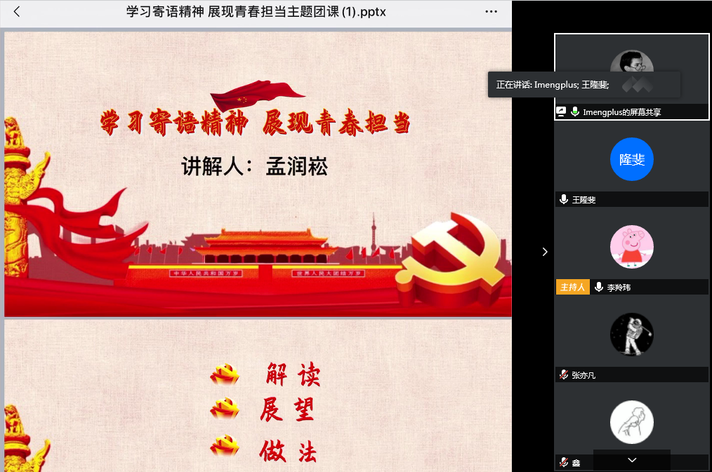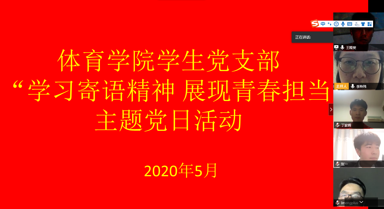 为进一步学习习近平总书记对青年的寄语精神,强化学生青春担当、激发党员的责任意识,落实支部党员帮扶机制,5月12日ng28娱乐官网 学生党支部举行了“学习寄语精神展现青春担当”主题线上党日活动,支部书记李羚玮老师、全体学生党员以及ng娱乐 各团支部的团干参与此次活动。