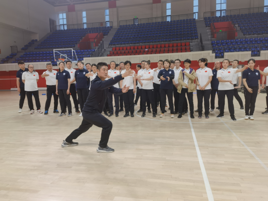 活动中,两位培训师首先观看了全体教师的教学技能展示,在肯定教师教学技能的同时,王洪领和程泽文两位培训师又从太极拳和少林拳的手、眼、身、形、步、技击原理以及教学方法等方面入手,深入浅出地对教师进行了细致的培训。参培教师也利用难得的机会与两位培训师进行了现场互动。最后,两位培训师分别展示了太极拳和少林拳的全套动作,迎来了老师们的阵阵掌声。