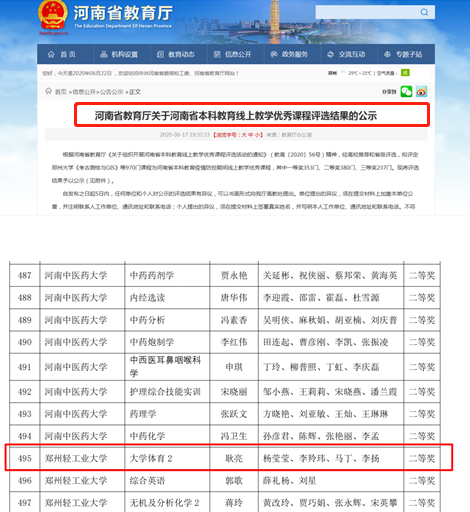 河南高等教育教学改革研究与实践项目成果展示一:大学体育2荣获河南省本科教育线上教学优秀课程二等奖
