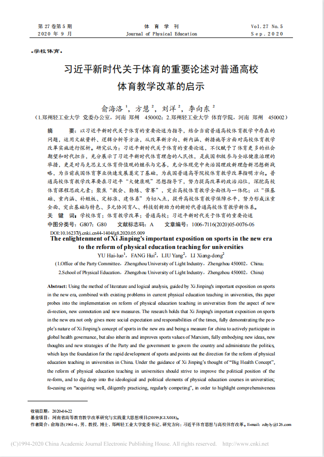 河南高等教育教学改革研究与实践项目成果展示五:核心(cssci)论文——习近平新时代关于体育的重要论述对普通高校体育教学改革的启示