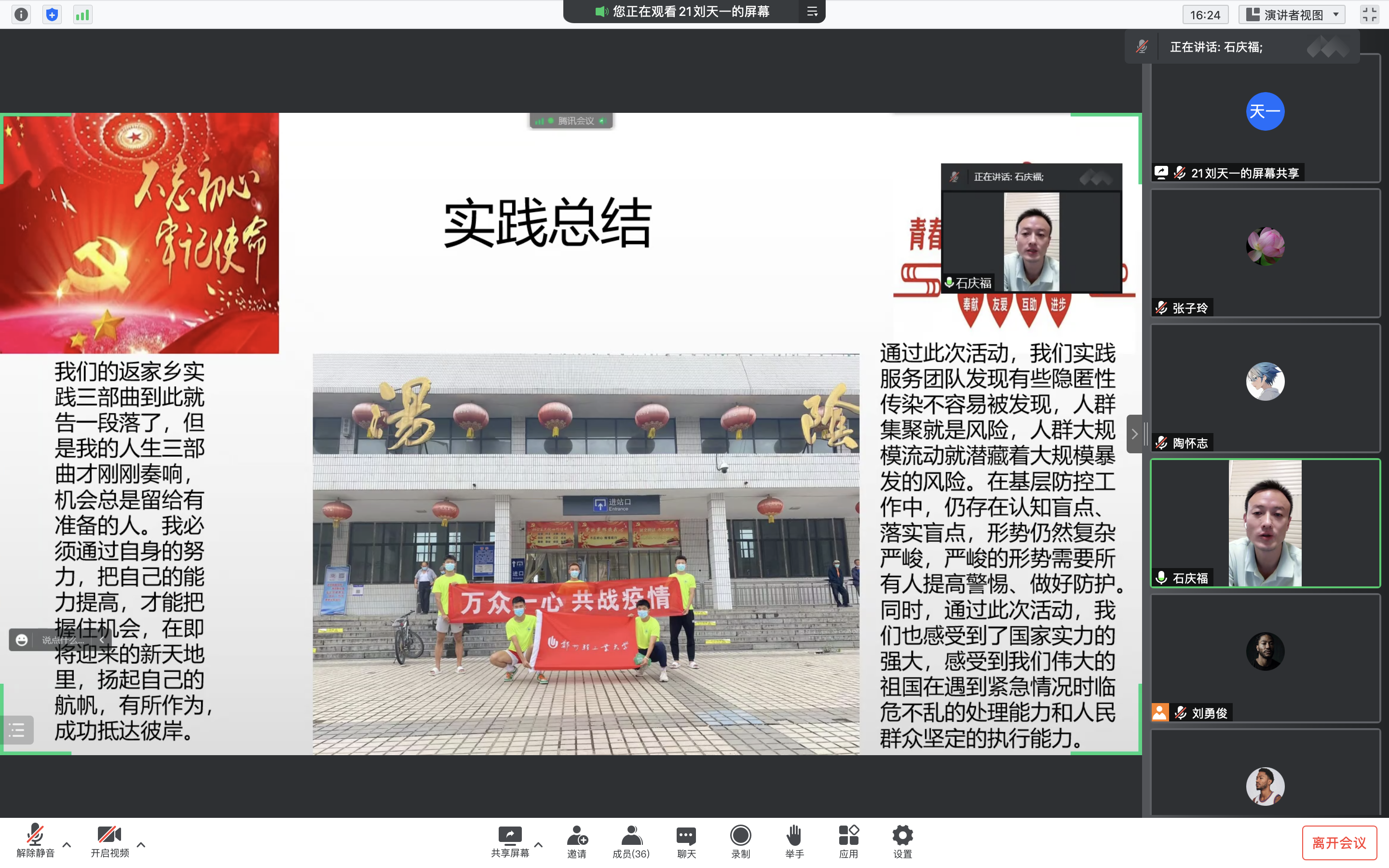 本次会议由“保护家乡母亲河实践小分队”和“向阳小分队”两个团队和四名同学分别进行团队和个人社会实践成果展示。会议期间,主持人首先向大家介绍了2022年暑期社会实践活动以及ng28娱乐官网 “轻体爱”志愿服务队的基本情况,鼓励大家多多参与到社会实践中。随后“保护家乡母亲河实践小分队”负责人杨佳慧借着深入学习宣传贯彻习近平生态文明思想,从“爱护环境”“绿色宣传”等方面讲述了团队特色活动。紧接着“向阳小分队”负责人刘天一从“响应疫情防控号召”方面向大家介绍了所在团队的实践成果。两支团队的实践成果都取得了良好的反响。社会实践团队成果展示结束后,21级张子玲、贺佳艺同学以及22级张友蓬、张展翔同学分别在会上分享了各自在暑期所参与的志愿服务、社会实践等经历,并做出暑期个人总结。最后,石庆福老师对2022年暑期社会实践活动做出总结及评价,鼓励大家做一个有理想、有责任、有能力的新时代大学生,积极参与社会实践。