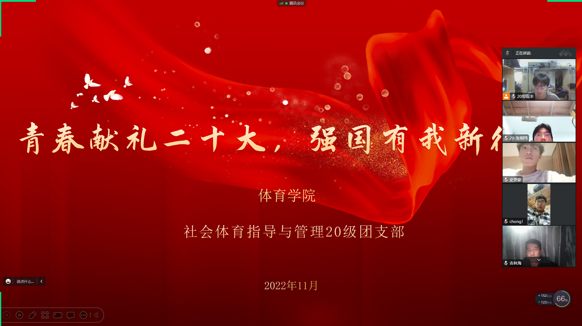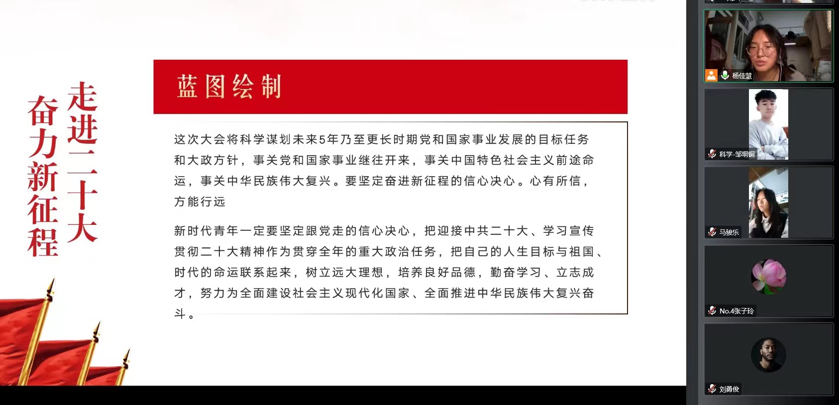 为深入学习党的二十大精神,引领广大团员青年听党话、跟党走,近日,ng28娱乐官网 各班级团支部开展了“青春献礼二十大,强国有我新征程”线上主题团日活动。