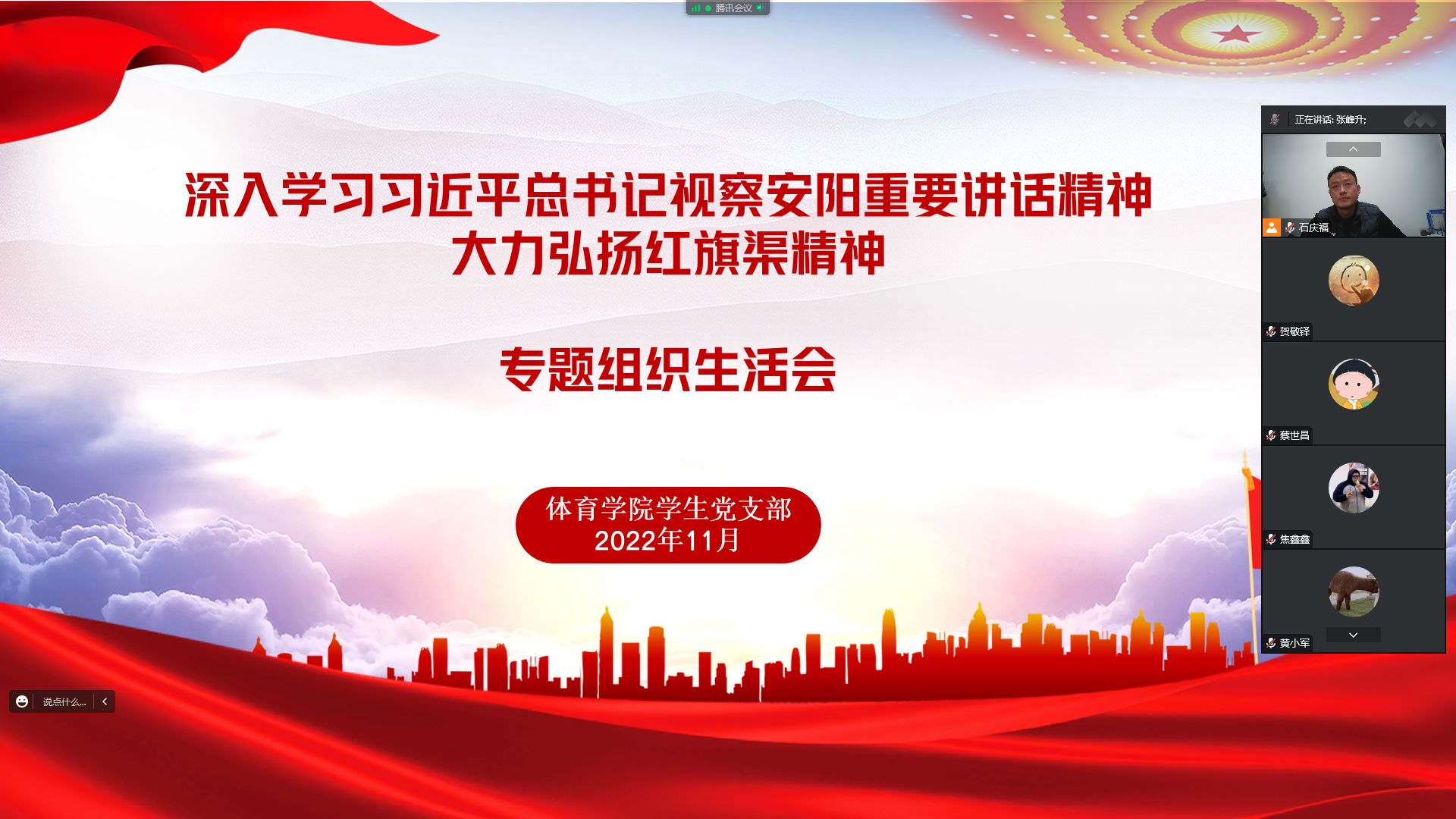 11月26日,体育ng娱乐 学生党支部召开以“深入学习习近平总书记视察安阳重要讲话精神,大力弘扬红旗渠精神”为主题的专题组织生活会。会议由支部书记石庆福老师主持。