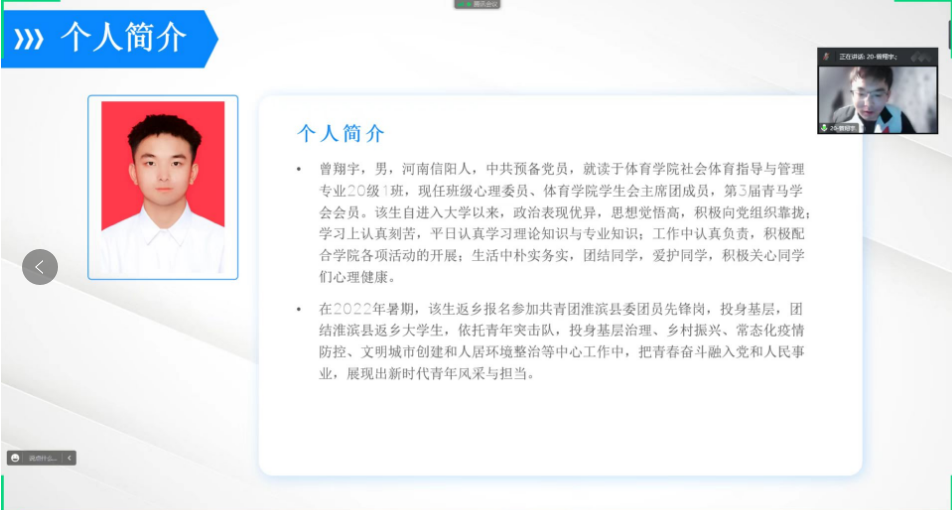 会上,候选人结合自己的事迹故事,从申请原因、学习成绩、社会实践、文体活动、学生干部经历等方面进行展示,分享了自己所获的奖项荣誉,凸显出高度社会责任感,回顾大学生涯中的自强之路展现新时代青年积极向上的精神风貌。不一样的展示,不一样的风采,给同学们留下了深刻的印象。展示过程中,老师们给两位候选人提出了宝贵的意见和建议,从语言表达、结构内容、特色挖掘、PPT格式、申请表规范等多方面提出细致指导。石庆福老师对两位候选人的综合能力表示了肯定,希望他们再接再厉,在今后取得更好成绩。同时,也鼓励其他同学向榜样看齐,夯实基础,勇于实践,不断发展自身,传播榜样力量。