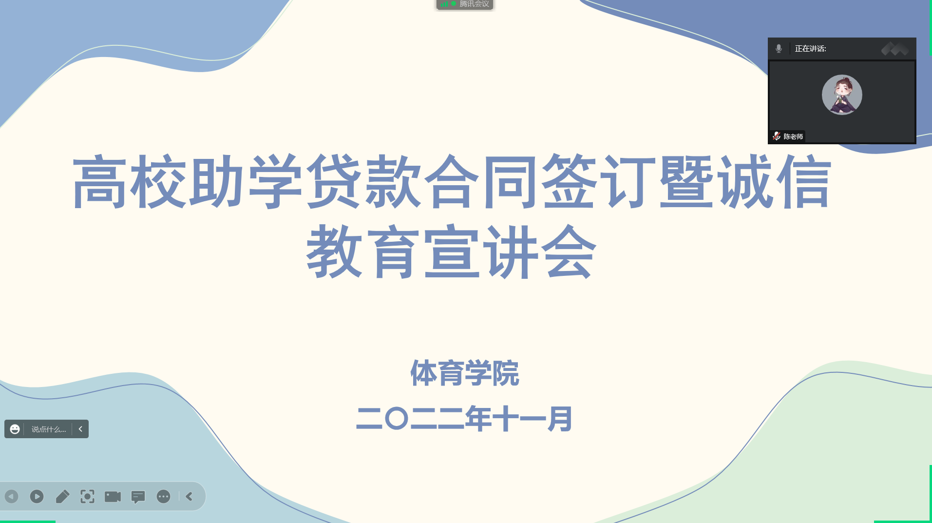 为宣传国家资助政策,增强贷款学生诚信还款意识,完善助学贷款工作流程,结合当前疫情防控要求,11月10日晚上,ng28娱乐官网 通过腾讯会议线上召开了2022年高校助学贷款合同签订仪式暨诚信教育大会。ng娱乐 负责资助工作的陈洁老师、院学生会资助部及全体贷款学生参加了会议。
