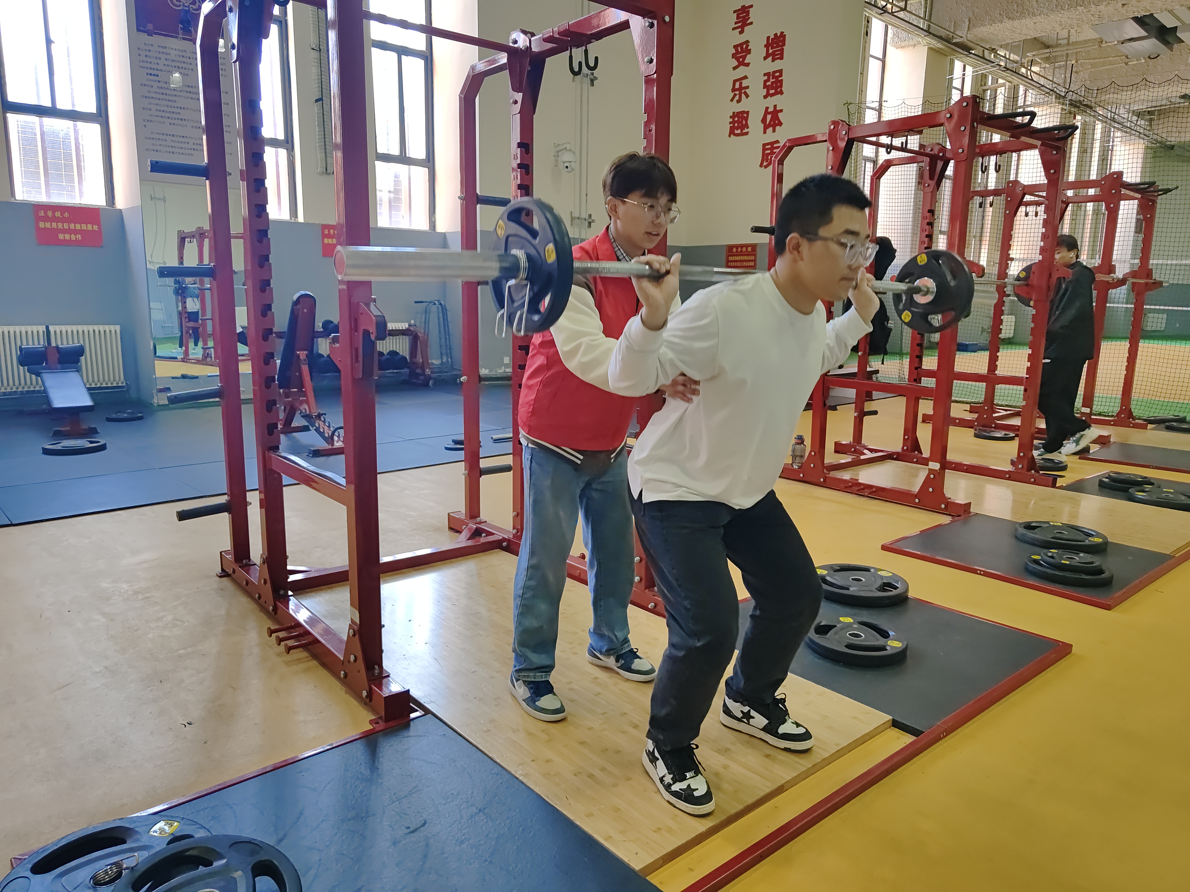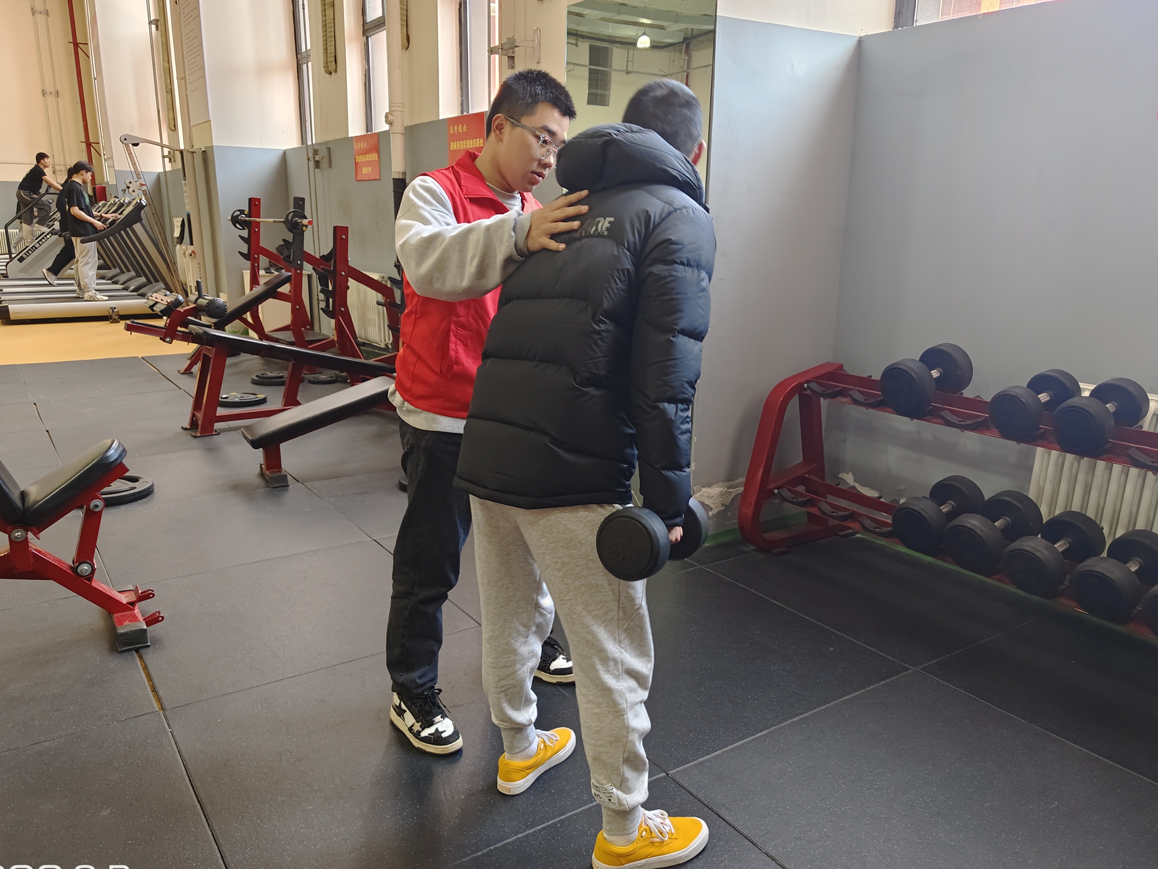 上午9点,志愿者们相约来到健身训练馆。志愿者们来到正在进行健身活动的同学身边,积极为他们进行健身指导。志愿者踊跃参与,在训练馆里充分发挥自己的特长,用形象、恰当的语言和完美的技术动作给健身爱好者进行了健身方面的指导。志愿者们有的亲自为健身爱好者做正确动作示范,有的用清晰、凝练的语言为健身爱好者讲解。在指导过程中,每名志愿者都帮助同学们纠正错误动作,针对同学们的不同需求向同学们提出具体解决方案。他们热情大方,专业严谨,赢得健身爱好者们的好评和掌声。