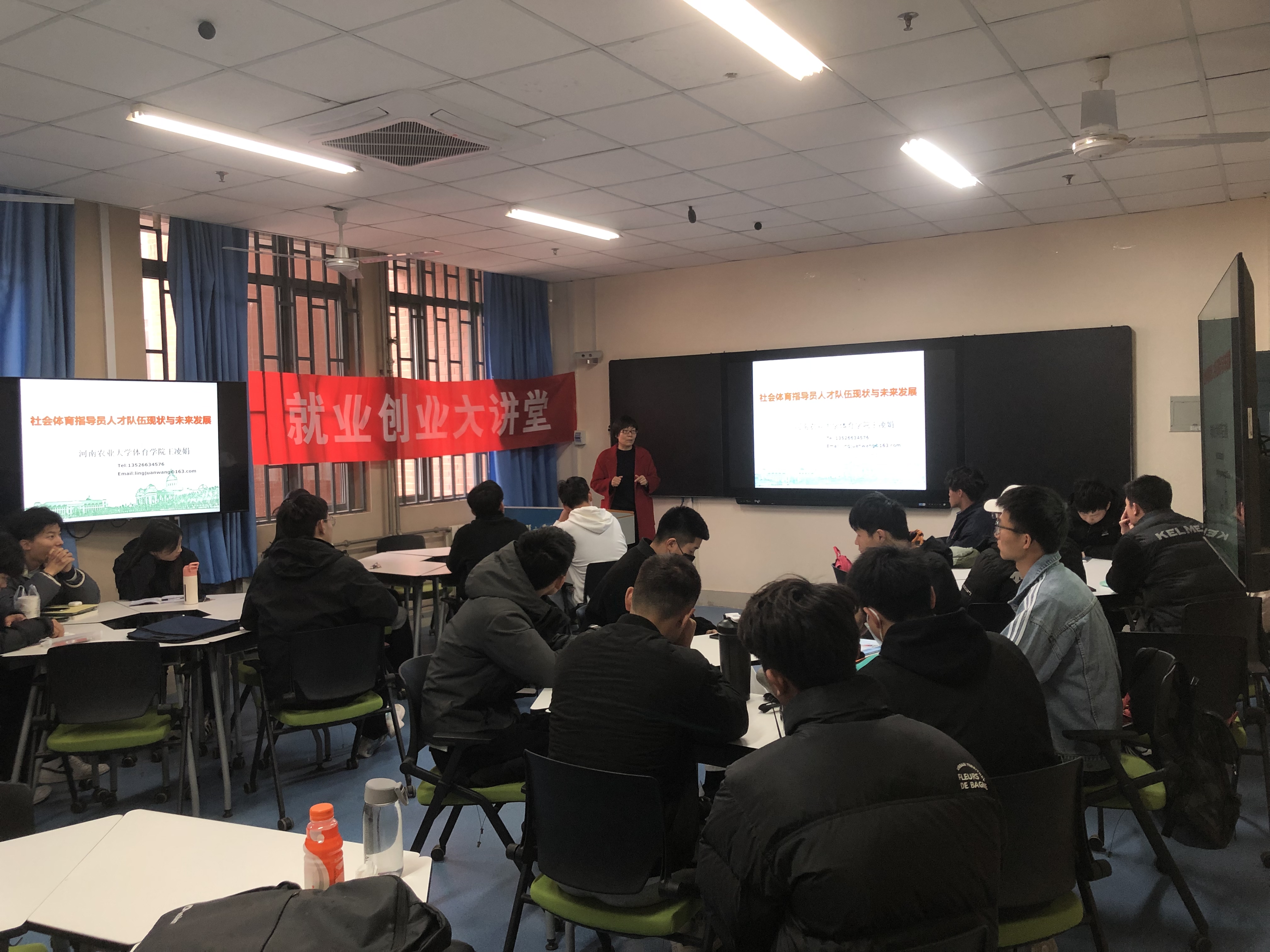 活动中,王老师从人民对健康生活的需求和健康与体质的关系讲起,首先分析了社会对体育类人才的需求。然后,结合社会体育指导员的特点,着重讲解了目前社会体育指导员队伍的工作性质、工作环境和工作内容,并分析了未来社会对社会体育人才的需求和社会体育专业人才面临的机遇与挑战。最后,王老师结合自身从事社会体育指导员培训的经历,向同学们讲授了社会体育指导员培训的内容、流程和鉴定办法。王老师强调,作为当代社会体育专业的大学生,必须努力学习专业技能和知识,敢于面对挑战,成长为一名对社会发展有用的社会体育指导者和组织者,为建设体育强国和健康中国做出自己的贡献。