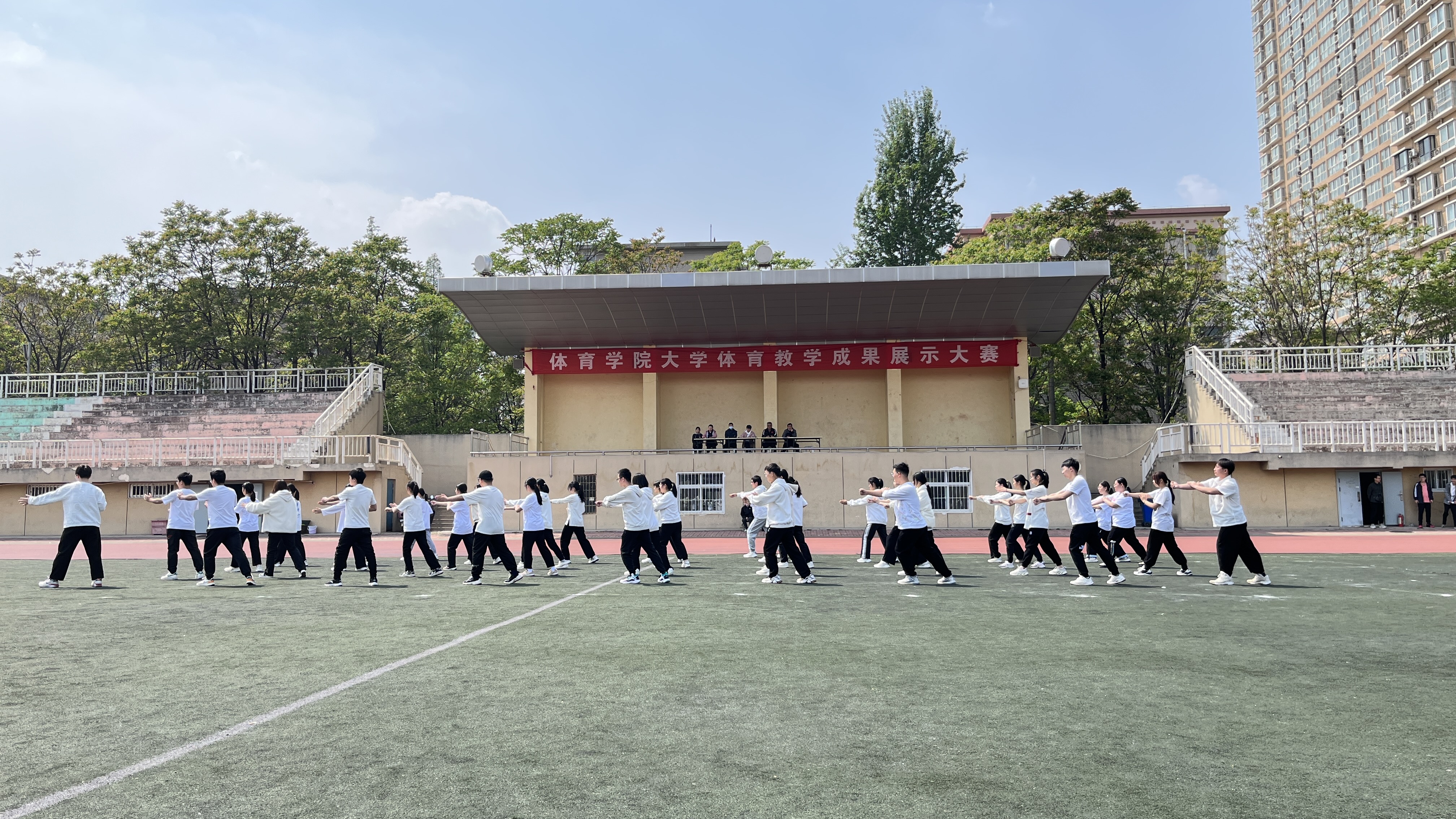 为了展示教学成果,提高教学质量,弘扬中华传统武术精神,4月7日中午,体育ng娱乐 在东风校区田径场举办了大学体育教学成果展示大赛。
