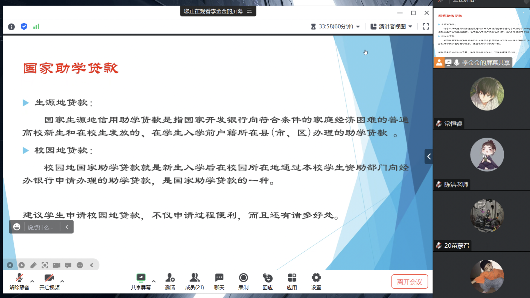 会议伊始,陈老师全面介绍了学校的资助工作,对学生资助政策文件详细解读,使学生深入了解国家奖助学金、国家助学贷款、勤工助学等政策,系统讲述了生源地助学贷款及校园地助学贷款的贷款、还款流程等注意事项,帮助学生更好地进行贷款申请等工作。接着,陈老师鼓励同学们要秉承诚信为本的原则,如实填写申请材料,并结合部分案例对不良校园网贷和贷款相关诈骗等进行全面剖析,呼吁同学们树立正确的消费观,坚决抵制不良诱惑,远离校园网贷。最后,陈老师耐心解答了同学们提出的疑问。