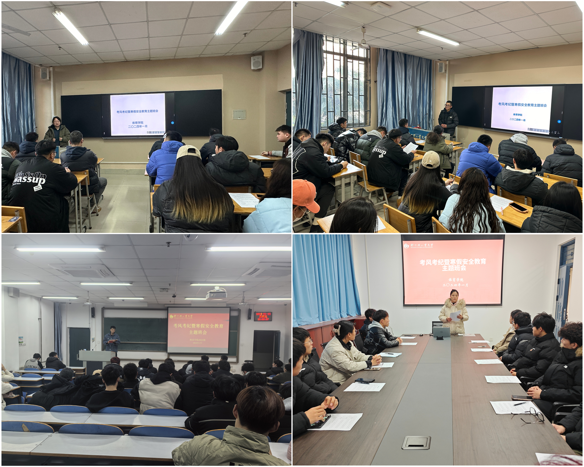 为严肃考风考纪,推进良好学风建设,做好学生寒假安全教育管理工作,确保学生有序离校,1月12日,体育ng娱乐 全体辅导员、班主任分批组织学生召开期末考风考纪暨寒假安全教育主题班会。