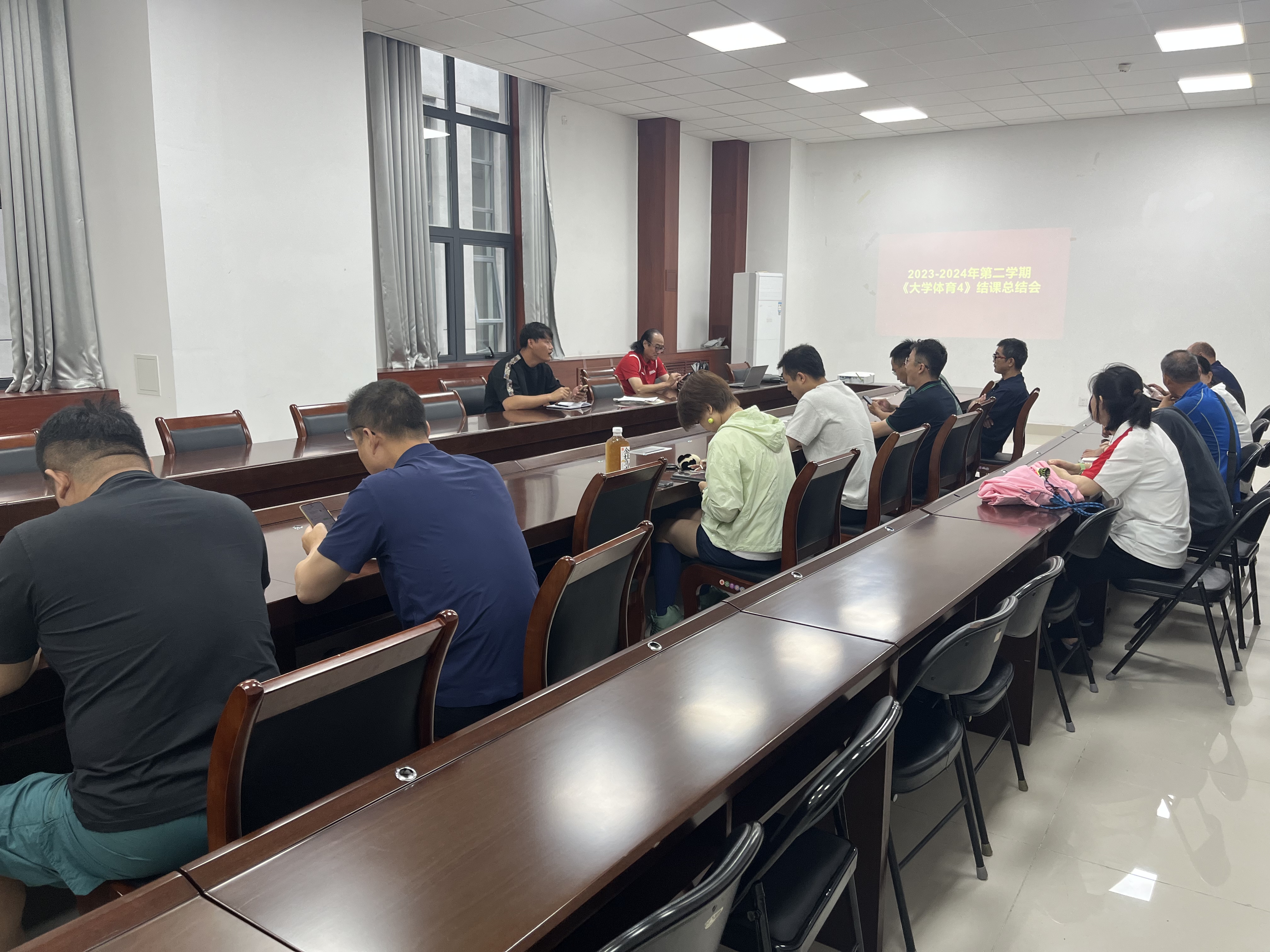 会议室召开《大学体育4》结课教学研讨会。会议由副主任张恒睿主持,全体任课教师参加会议。