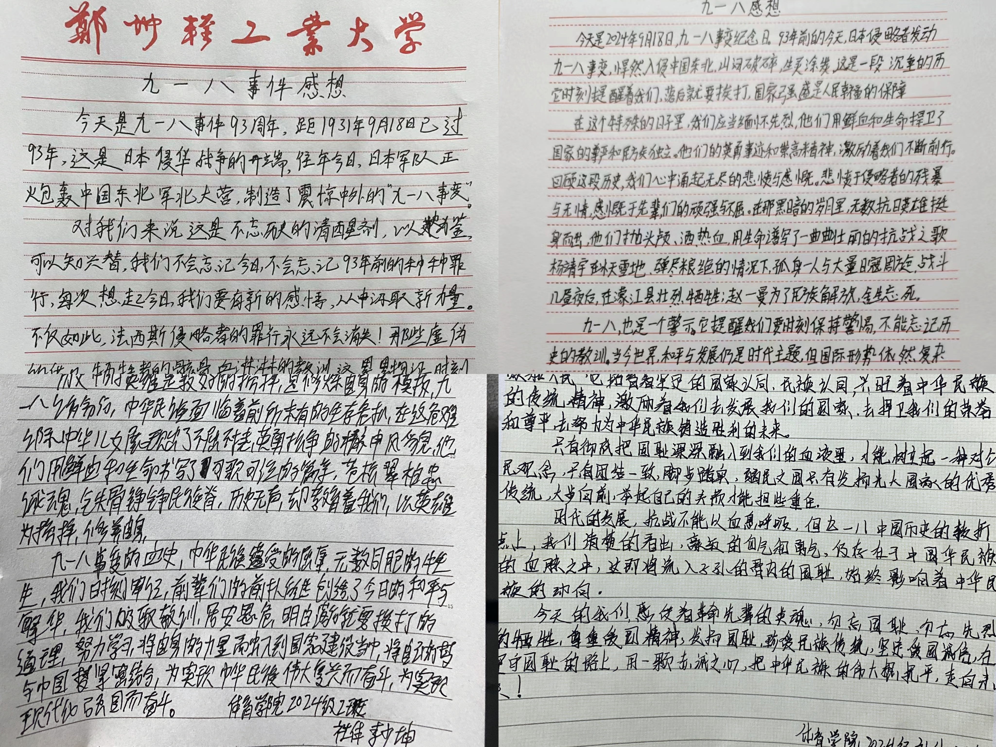 9月17日,组织2024级本科生开展了“九一八”主题学习活动,引导青年学子学习中国共产党领导全国各族人民同日本侵略者展开抗战的历史,缅怀先烈,珍视和平。活动后,学生们纷纷撰写心得体会,更加深刻地认识到了自己肩负的责任与使命,立志要积极投身中国式现代化建设,为实现中华民族伟大复兴接续奋斗。