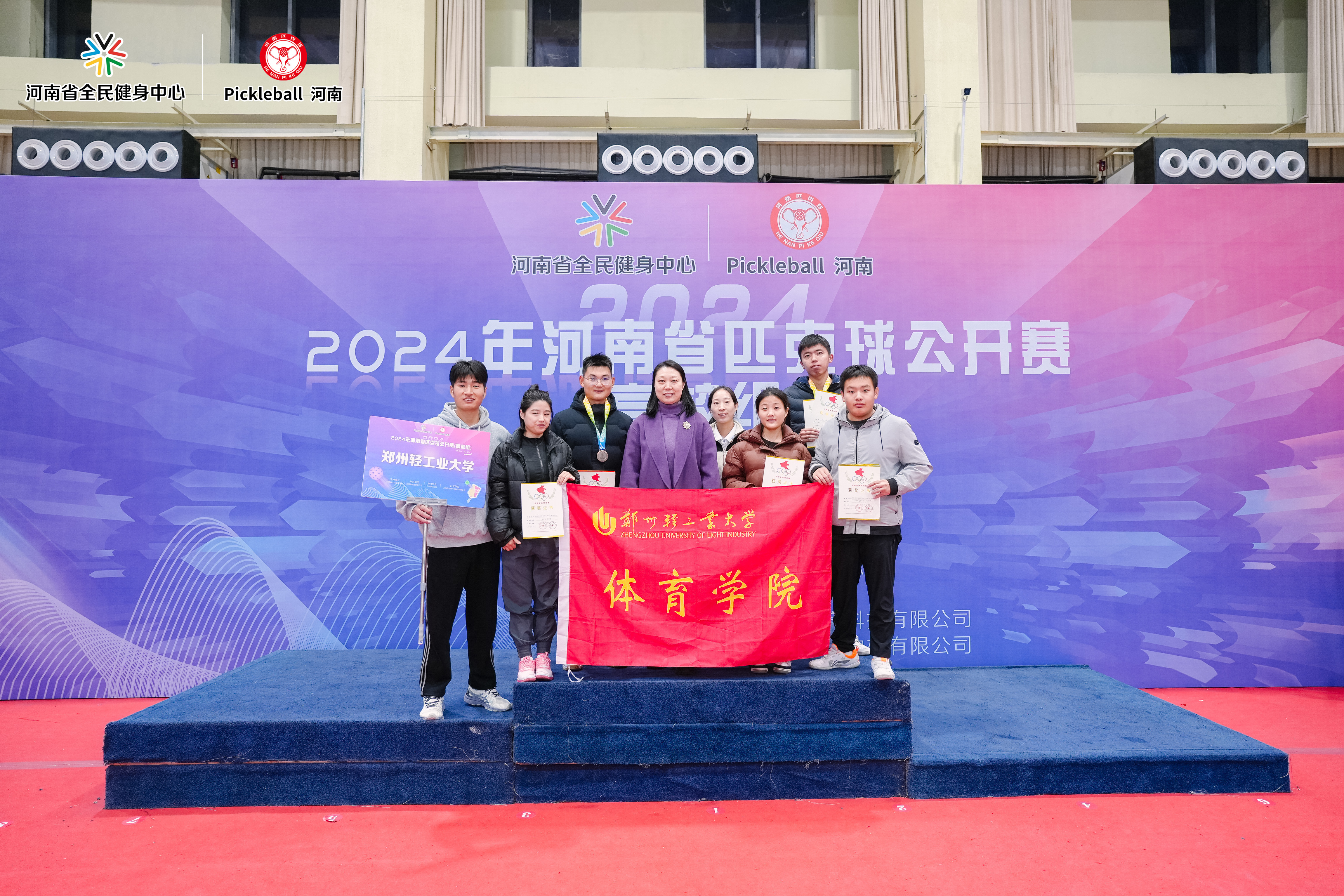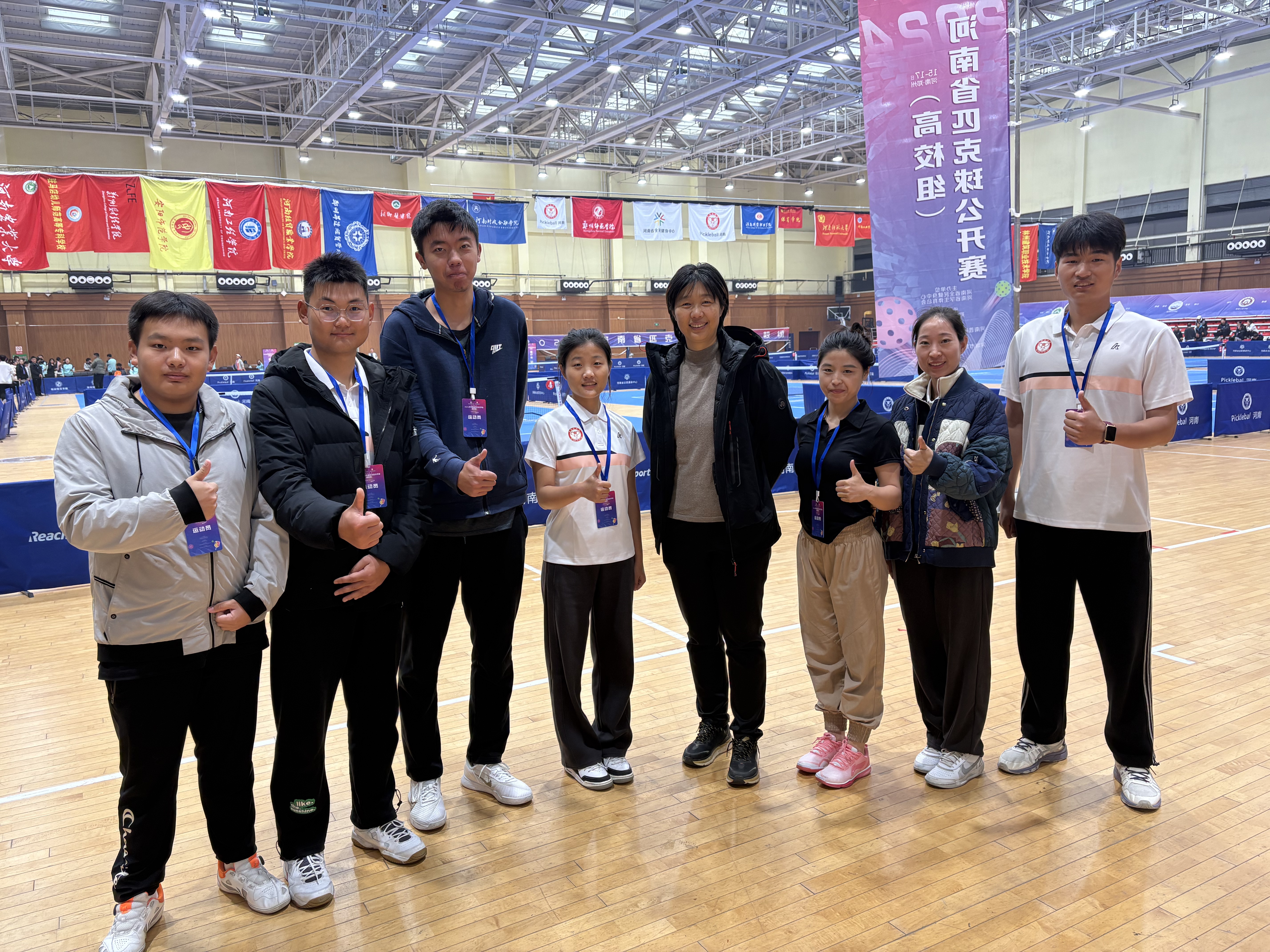 匹克球作为我国一项新兴的体育运动是国家体育总局小球管理中心、河南省全民健身中心积极推广与发展的重点运动项目。学校匹克球队在学校、ng娱乐 领导的大力支持下,第二次参与匹克球比赛。赛中,队员们激情拼搏、奋勇争先、团结协作展现出了应有的体育精神,备受赛事组委会、裁判组赞誉,并与奥运冠军孙甜甜合影留念。