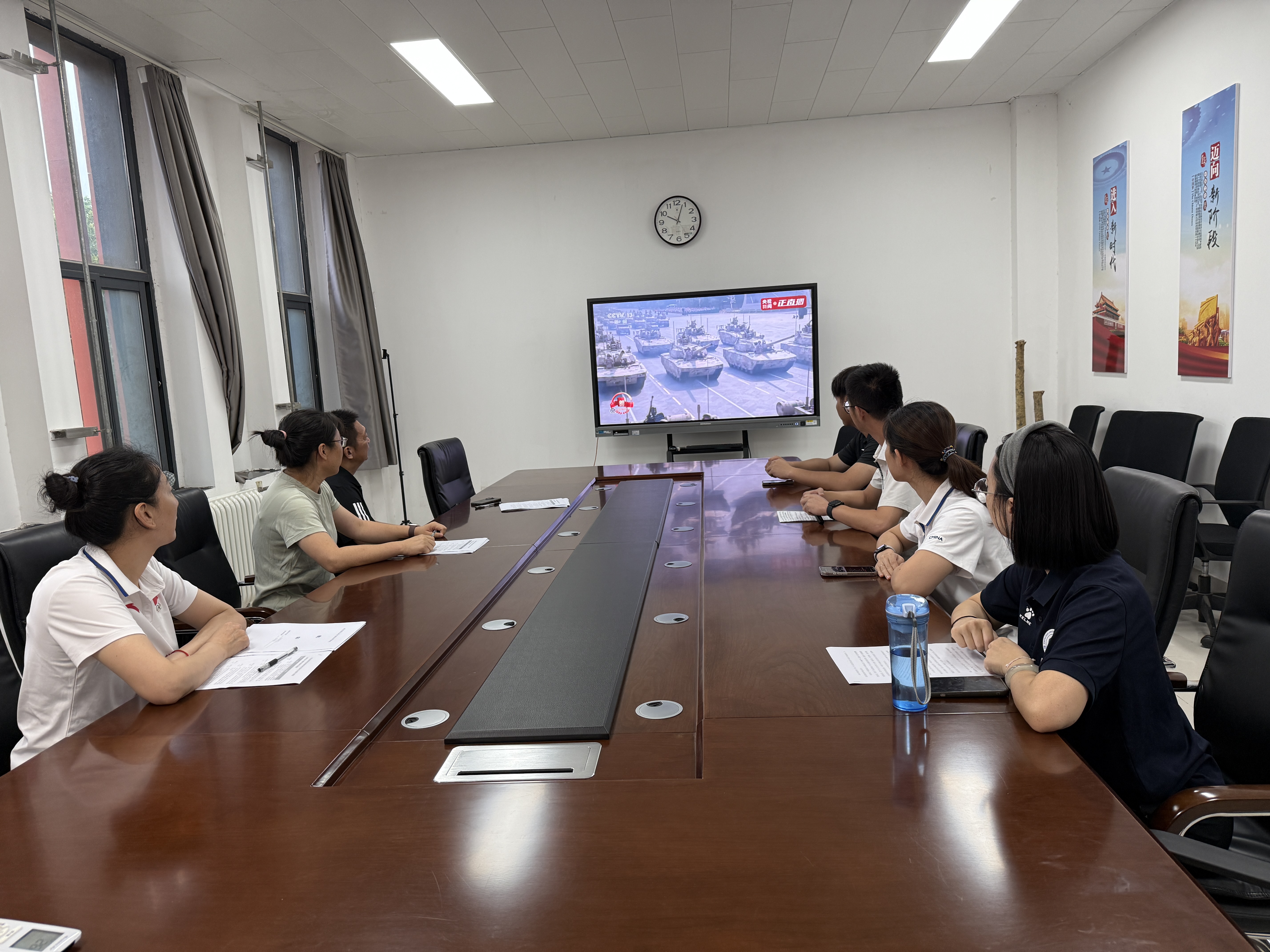 全体教师认真聆听习近平总书记在大会上发表的重要讲话。阅兵仪式上,整齐划一的方阵、先进精良的装备依次亮相,教师们全神贯注,眼神中满是自豪与激动。